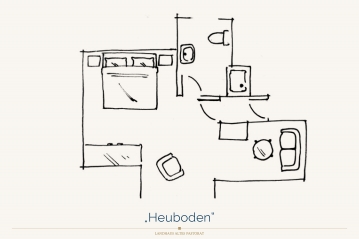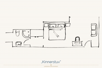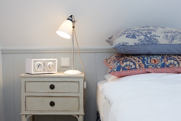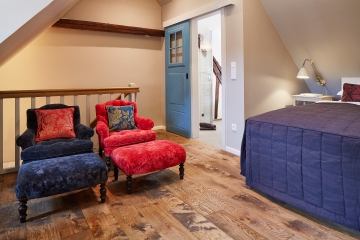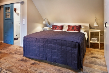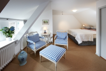 Der ehemalige Heuboden beherbergt ein großzügiges, helles Doppelzimmer. Etwas seperater liegt es direkt neben der kleinen Hotelbibliothek. Eine gehobene nordische Einrichtung in blau-weiß unterstreichen den Reiz des Zimmers. Aus der Friesengaupe fällt der Blick auf die Terrasse und den schön angelegten Hotelgarten.
