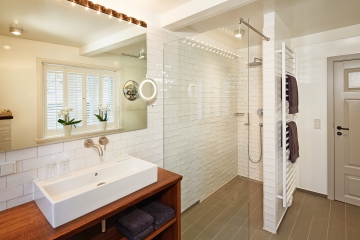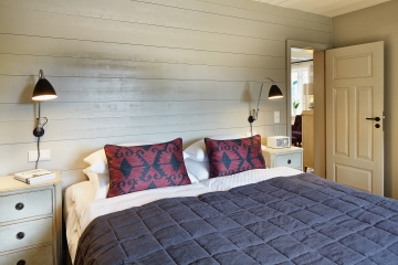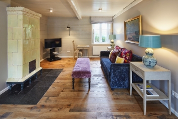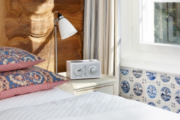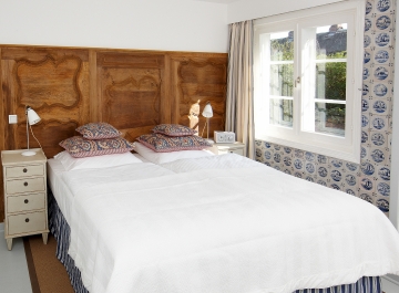 Unsere Gartensuite besticht durch helle, freundliche Räume und eine geschmackvolle individuelle Ausstattung. Wände mit alten Delfter Fliesen und ein antiker Kachelofen im Wohnraum zeugen von der liebevollen Erhaltung dieser historischen Räume. Von besonderem Reiz ist auch die ausgefallene Wandvertäfelung im Schlafzimmer. Exklusiv der eigene Ausgang in den gemeinsamen Hotelgarten.