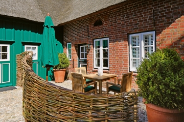 Gegenüber des Haupthauses, nur durch ein schmales Sträßchen getrennt, finden Sie unseren liebevoll restaurierten Friesenhof. Dieser beherbergt zwei Suiten und ein Doppelzimmer. Großzügig, hell in einem ausgefallenen, stilvollen Ambiente präsentiert sich die Suite Büürsteed. Ein antiker Kachelofen aus dem 18. Jahrhundert, handgemalte Tapeten und ausgesuchte Gemälde an den Wänden unterstreichen einen exklusiven Charakter. Ausgefallen die Klöntür, die auf die Suiteigene kleine Terrasse führt.