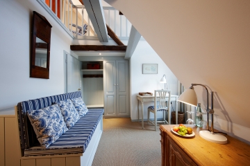 Verwunschen und sehr großzügig auf zwei Ebenen hat diese Suite einen besonders liebenswerten Charakter. Die Galerie beherbergt einen behaglichen Schlafplatz direkt unter dem Reetdach. Eine ausgewählte, komfortable Einrichtung und ein Badezimmer mit Wanne und Dusche runden das Bild ab.